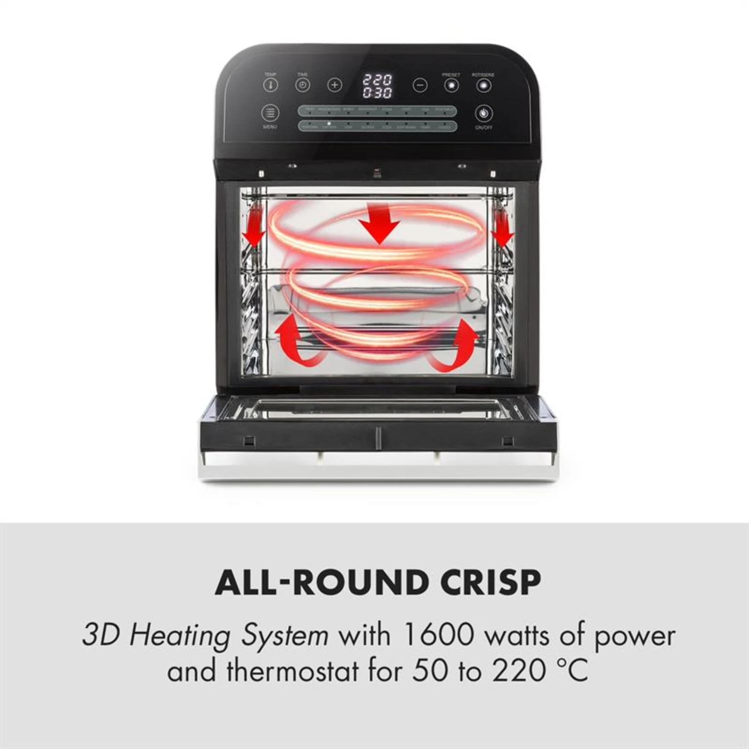 Geheimnis der Klarstein Aero Vital Cube Fritteuse ist das 3D Heating System, das mit 1600 Watt und zirkulierender Heißluft frittiert, backt, grillt oder röstet. Dabei wird die Wärme dank topseitigem Edelstahl-Heizelement und rückseitigem Umluftventilator schnell und optimal verteilt und gart Lebensmittel von allen Seiten schonend und rasant, ein Auftauen ist nicht nötig. Dabei ist die Bedienung ganz einfach, denn die AeroVital Cube arbeitet mit Easy Start: Eines von 16 Programmen per Touch-Panel auswählen und Temperatur und Garzeit sind direkt für das gewünschte Gericht voreingestellt. Nur noch Start drücken und schon verrichtet die Fritteuse ihren Dienst. Natürlich können Individualisten Temperatur und Laufzeit auch manuell einstellen. Die Temperatur kann in 10-°C-Schritten von 50 bis 220 °C und die Garzeit in 1-Minute-Schritten bis 60 Minuten eingestellt werden. An Programmen stehen 13 einzelne Gerichte wie Pommes, Pizza, Kuchen, Fisch, Gemüse oder Hähnchen sowie 3 Funktionen zum Auftauen, Warmhalten und Dörren zur Auswahl.