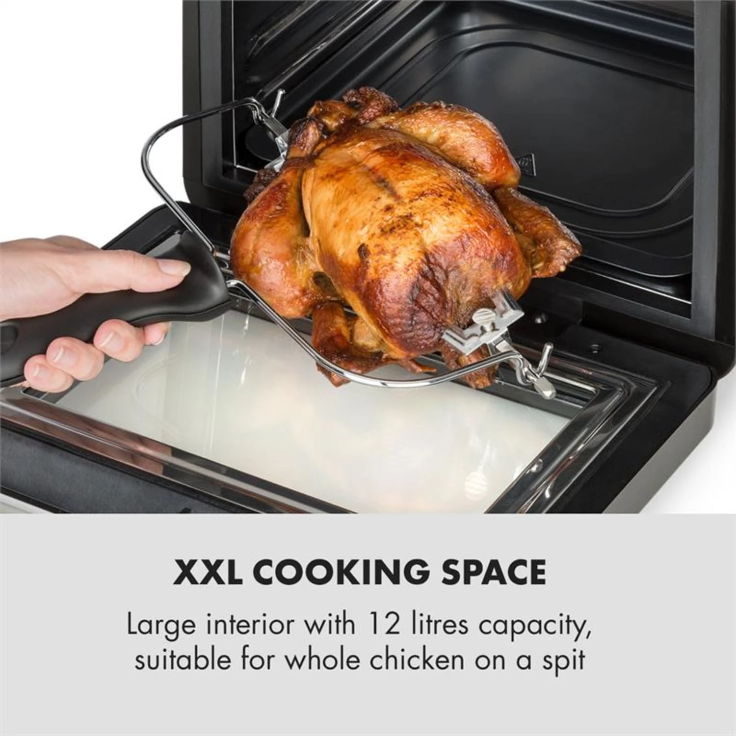 Der große XXL Innenraum lässt mit seinen gewaltigen 12 Litern Kapazität kaum Zubereitungswünsche offen und fasst sogar ein ganzes Grillhähnchen. Dabei ist die Klarstein AeroVital Cube Heißluftfritteuse dank ihres Mini-Backofen-Designs besonders kompakt und nimmt auf der Anrichte gerade einmal soviel Platz ein, wie eine herkömmliche Fritteuse! Das umfangreiche Zubehörset ist optimal auf alle nutzungszwecke eingerichtet: Eine Tropfwanne zum Auffangen von austretendem Fett, ein Grillrost und ein Grillkorb für großes und kleines Frittiergut wie ChickenWings oder Kroketten und ein Rotisseriespieß mit zugehörigem Drehspießheber gehören zum Lieferumfang. Und das beste ist: Hier kann man nach Lust und Laune frittieren, ohne sich um die Kalorien sorgen zu müssen, denn alles wird mit Heißluft völlig ohne Ölzugabe gegart.
