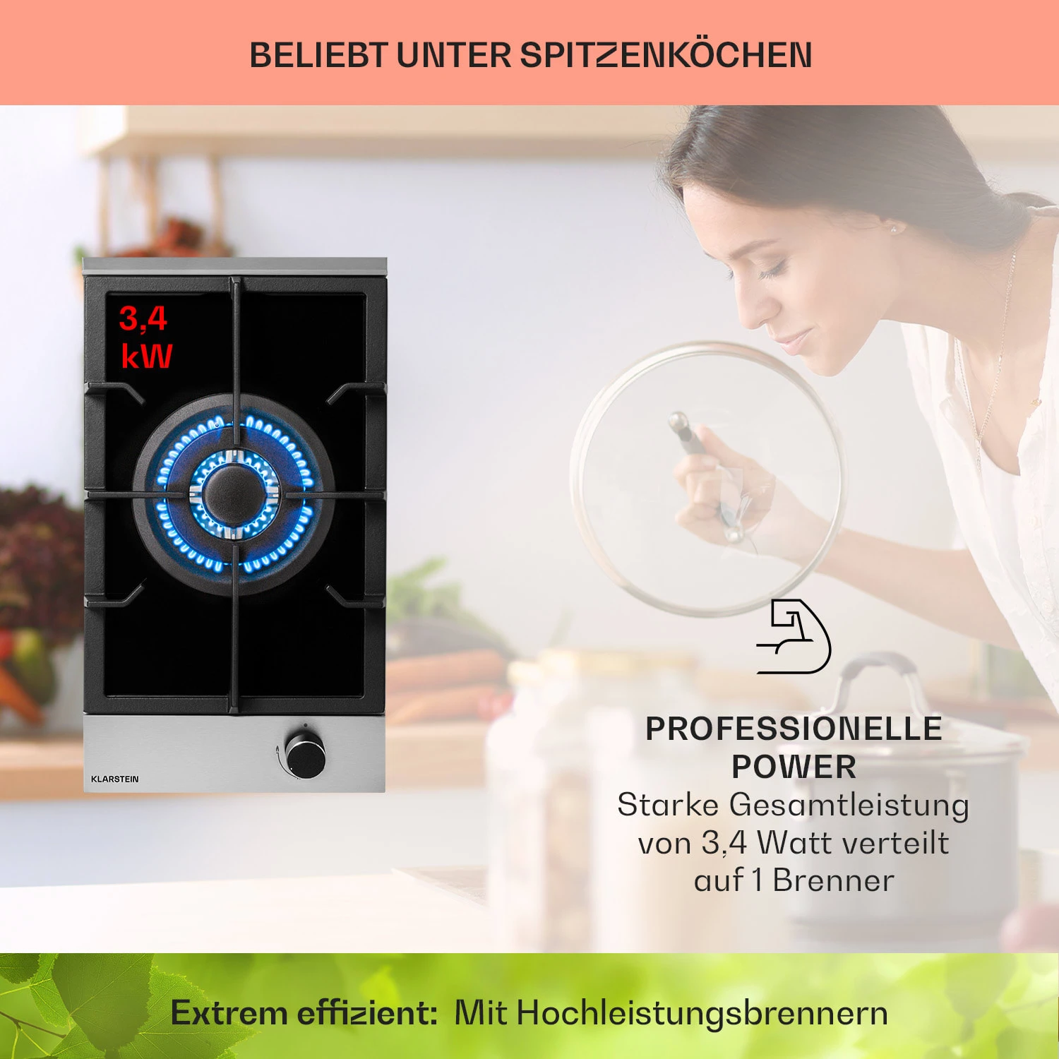 Feuer frei für effektives und umweltfreundliches Kochen: Das platzsparende Alchemist Gaskochfeld von Klarstein heizt deinen Töpfen und Pfannen mit dem 3,4 kW starken Wokbrenner ordentlich ein. Dabei ist die Bedienung dank der selbsterklärenden Symbole am großen Drehknopf absolut einfach und intuitiv. Der Brenner verteilet die Hitze gleichmäßig in der Mitte und an den Rändern deines Kochgeschirrs, somit wird alles perfekt, gleichmäßig und auf den Punkt gegart. Das Kreuz aus massivem Gusseisen ist für beinahe alle Arten von Kochgeschirr geeignet und sitzt passgenau und kippsicher über der Flamme.