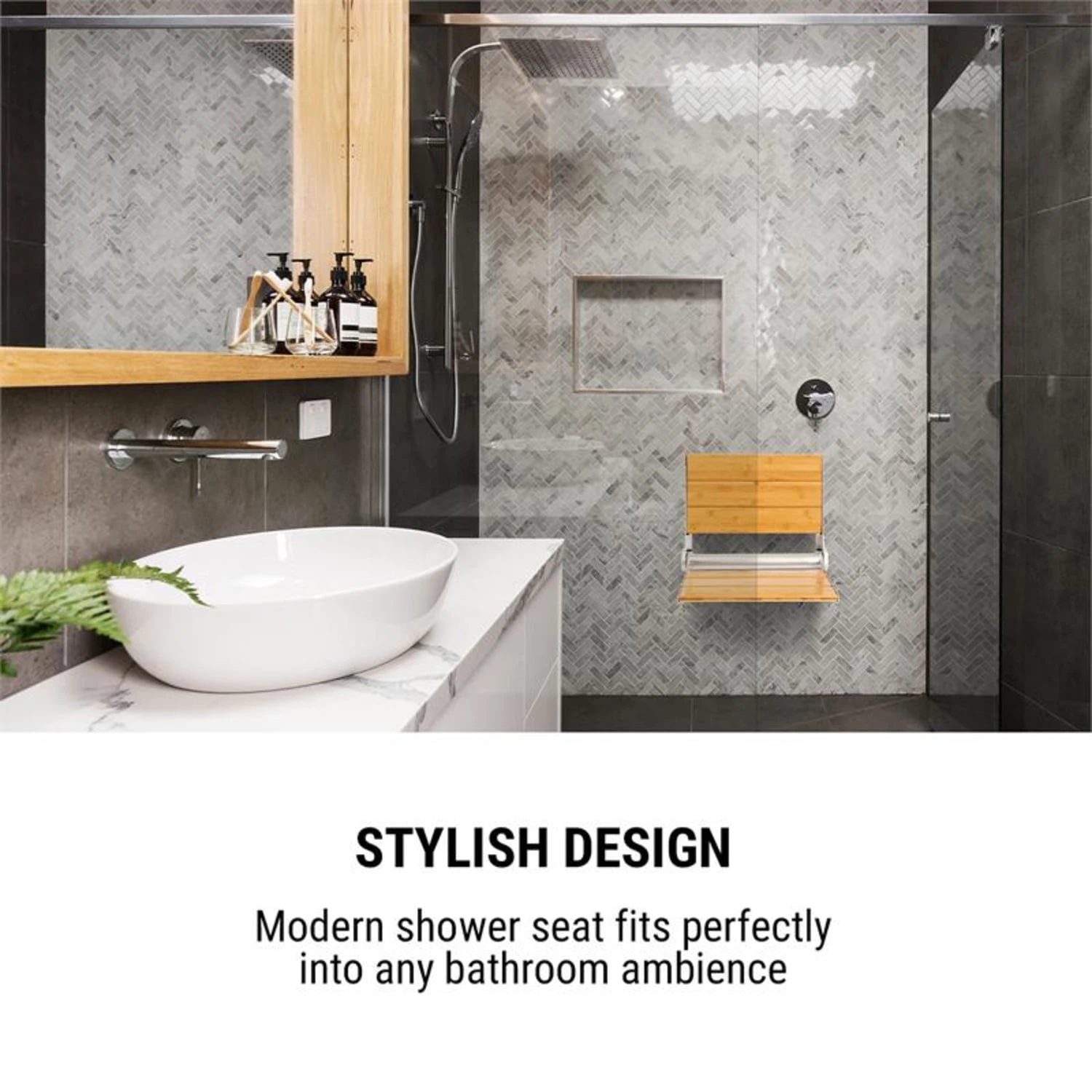 Der Duschsitz verfügt über eine bequeme Sitzfläche und Lehne aus Bambus und lässt sich nach dem Gebrauch platzsparend nach oben klappen. Dank eines leichten Rahmens aus Aluminiumlegierung überzeugt er nicht nur mit einem modernen und stilvollen Design, sondern kann dank des mitgelieferten Montagesets auch im Handumdrehen angebracht werden. Trotz seines geringen Gewichts ist er äußerst stabil und hält einer Belastung von bis zu 160 kg stand.