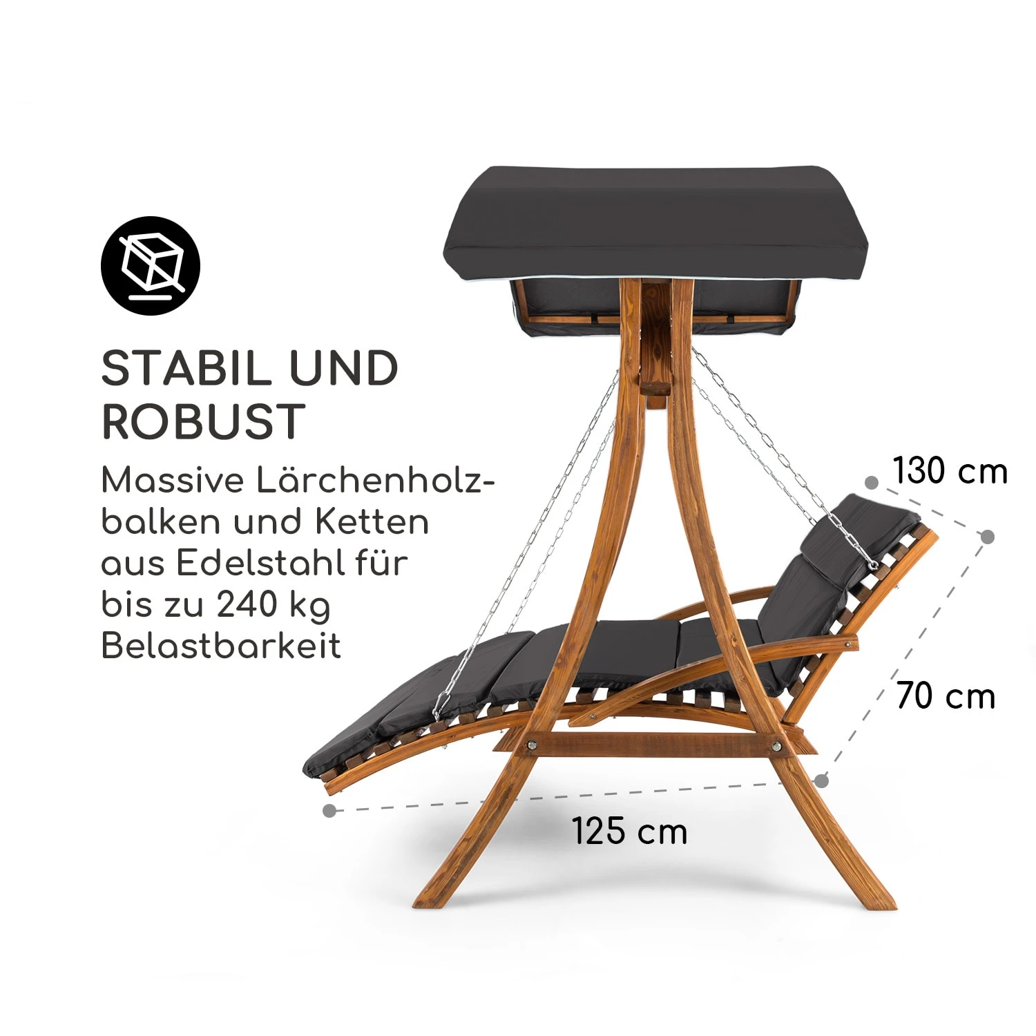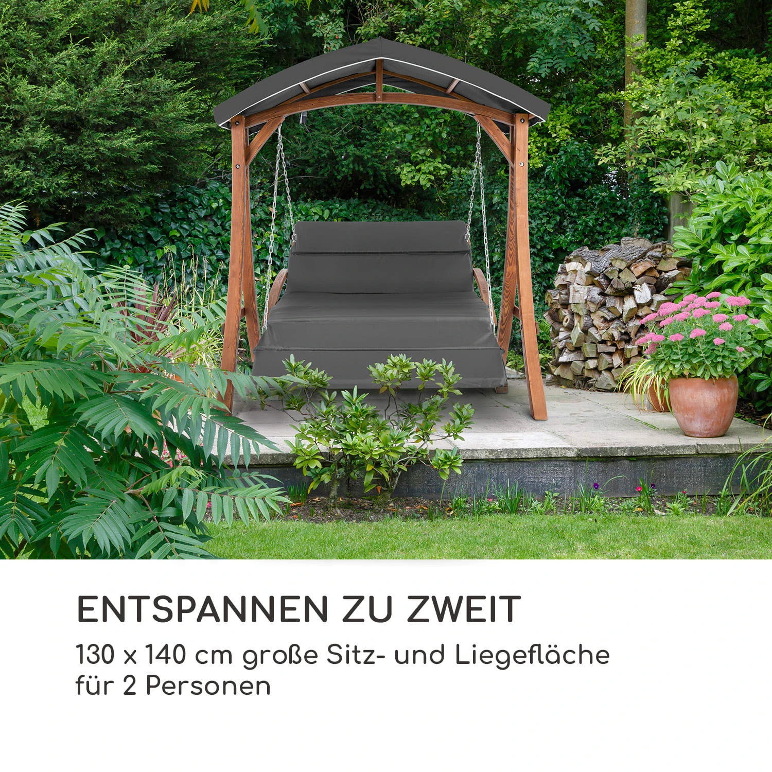 Die Blumfeldt Aruba Hollywoodschaukel macht es ganz leicht, den Alltag zu vergessen. Auf ihrer 130 x 140 cm großen, ergonomisch sanft geschwungenen Sitz- und Liegefläche mit 4 cm dicker Polsterung schaukelt es sich allein oder zu zweit komfortabel wie in einem Liegestuhl. Das übergewölbte Sonnendach bringt zusätzliche Geborgenheit und schützt obendrein vor all zu kecken Sonnenstrahlen – egal wo die Schaukel ihren Platz findet. Auch in puncto Standsicherheit bleiben keine Wünsche offen. Massive Holzbalken, rostfreie Edelstahlketten und vollverzinkte Schrauben sorgen für eine hochstabile Konstruktion die mit bis zu 240 kg belastbar ist. Das graue Sonnendach und das witterungsfest lasierte Lärchenholz zaubern Sommerstimmung in jede Sitzecke.