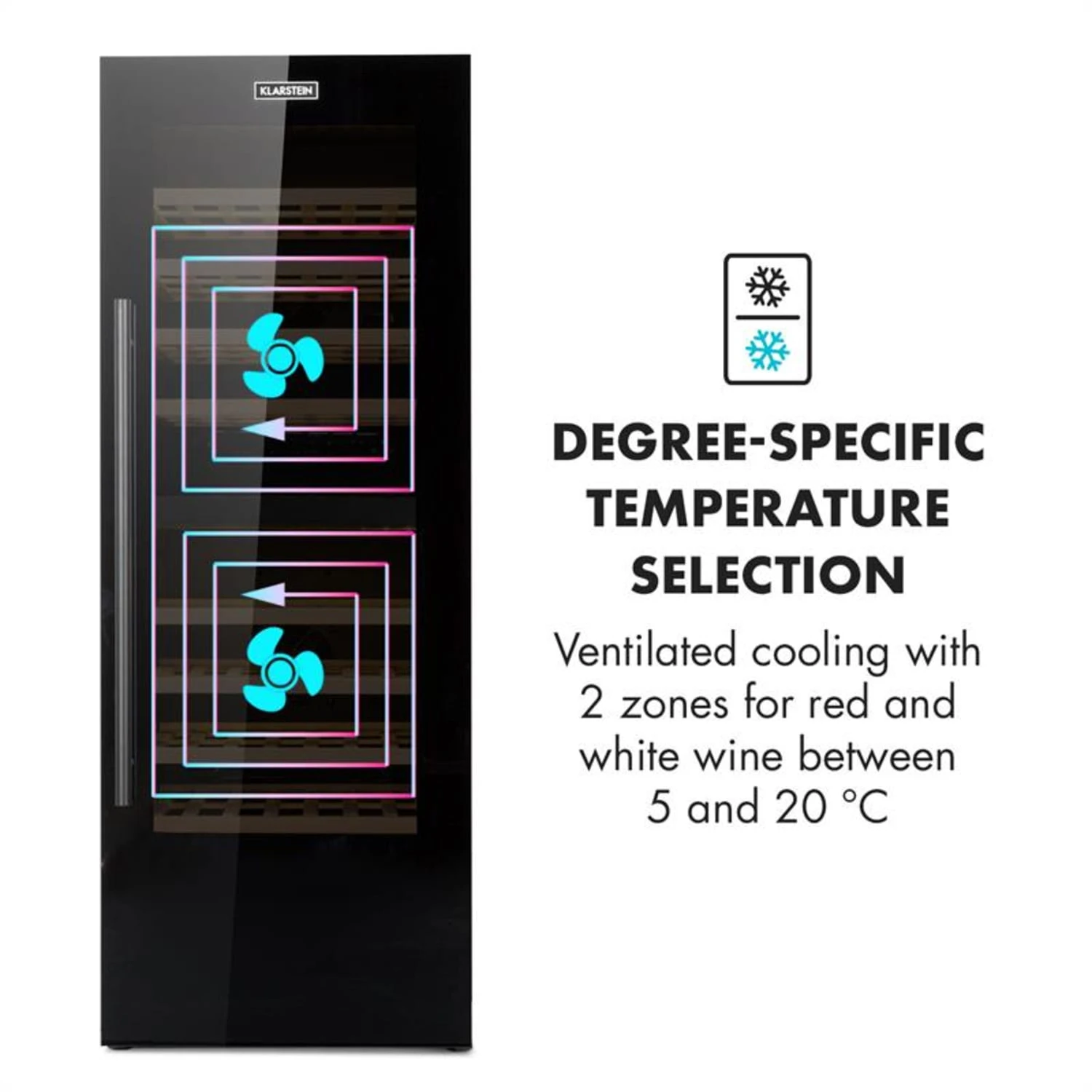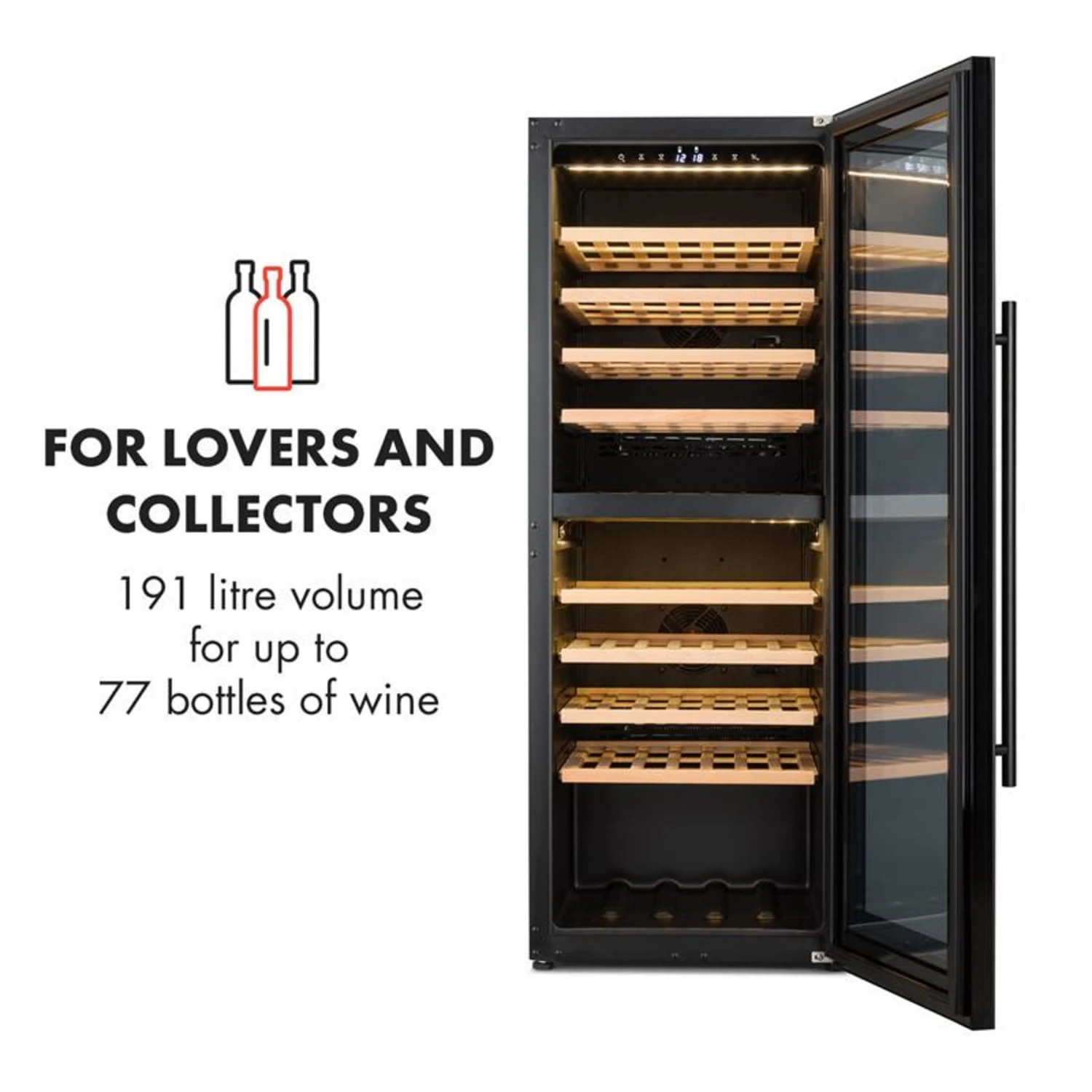 Für die volle Entfaltung seines Geschmacksaromas muss Wein auf die richtige Temperatur gekühlt werden. Mit dem Klarstein Barossa 77 Duo Weinkühlschrank ist das ganz einfach – in einem edlen Ambiente. In seiner oberen und unteren Temperaturzone beherbergt er bis zu 77 Flaschen Wein. Über ein einfaches Bedienfeld mit LCD-Anzeige wird jeweils die Temperatur für beide Kühlbereiche eingestellt. Dadurch können Weiß-, Rot- oder Rosé-Wein punktgenau gekühlt werden. Für eine gekonnte Präsentation der Weinschätze sorgt die Panorama-Fronttür aus 3-lagigem Sicherheitsglas mit ihrer schwarzen Hochglanzeinfassung. Die zuschaltbare Innenbeleuchtung setzt die gelagerten Flaschen gekonnt in Szene. Damit ist er nicht nur im heimischen Bereich, sondern auch in Bars und Restaurants ein stilvoller Blickfang.