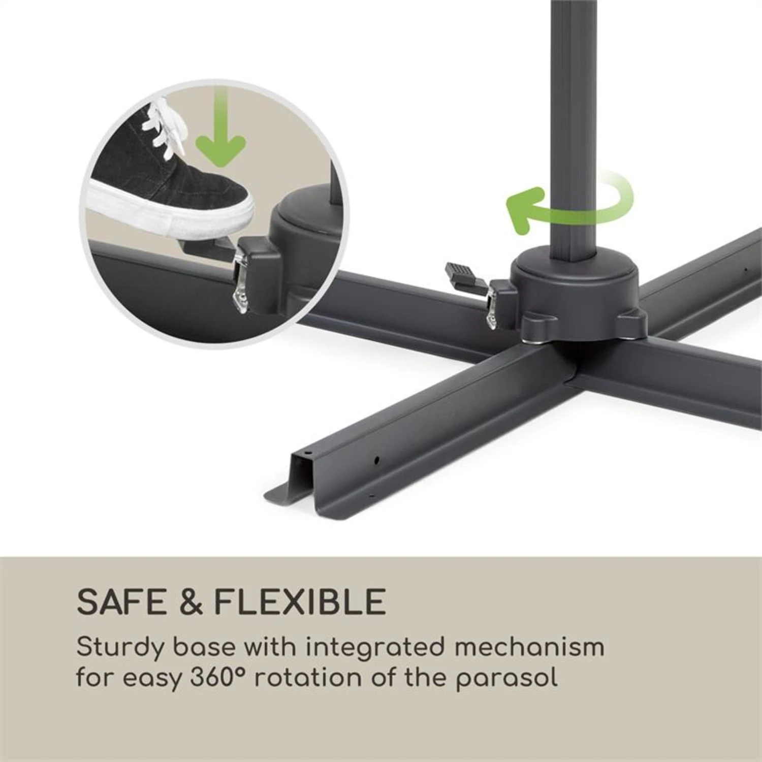 Durch eine sichere Standbasis kann der Belo Horizonte flexibel 360° um seine eigene Achse rotieren und schenkt auch ohne komplettes Verstellen kühlenden Schatten bei wechselnder Sonneneinstrahlung. Das 292 cm durchmessende Sonnendach aus wasserabweisendem Polyester mit PA-Beschichtung und UV-Schutz 30+ erteilt dabei leichtem Regen und UV-Licht zuverlässig eine klare Absage. Ein robustes wie leichte Standbein aus Aluminium mit Rostschutz überzeugt dabei nicht nur durch eine hohe Stabilität, sondern ermöglicht auch den einfachen Transport der gesamten Konstruktion. Durch seine intelligente Bauweise mit Kunststoffkurbel und Aluminiumkurbelgriff lässt sich der Sonnenschutz im Handumdrehen auf- bzw. zuklappen und in 4 Stufen im gewünschten Winkel an die Sonneneinstrahlung anpassen. In geschlossenem Zustand kann er bis zur erneuten Verwendung platzsparend verstaut werden. Die mitgelieferte Standbasis sorgt darüber hinaus jederzeit für einen sicheren Halt.