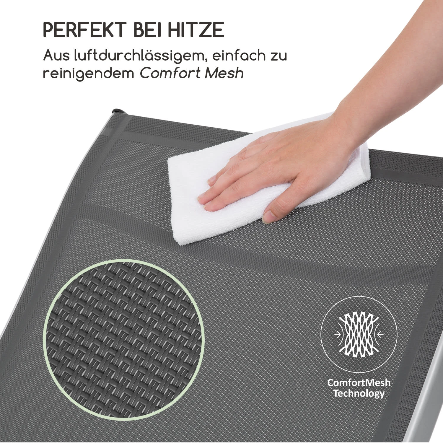 Die Sonnenliege bietet eine Entspannungsfläche aus luftdurchlässigem Comfort Mesh, das hervorragend für warme Sonnentage geeignet ist und sich durch die pflegeleichte Textilstruktur besonders einfach reinigen lässt. In vier Stufen bei einer Höhe von 51-90 cm passt sich die verstellbare Rückenlehne jederzeit mit wenigen Handgriffen den eigenen Bedürfnissen an.