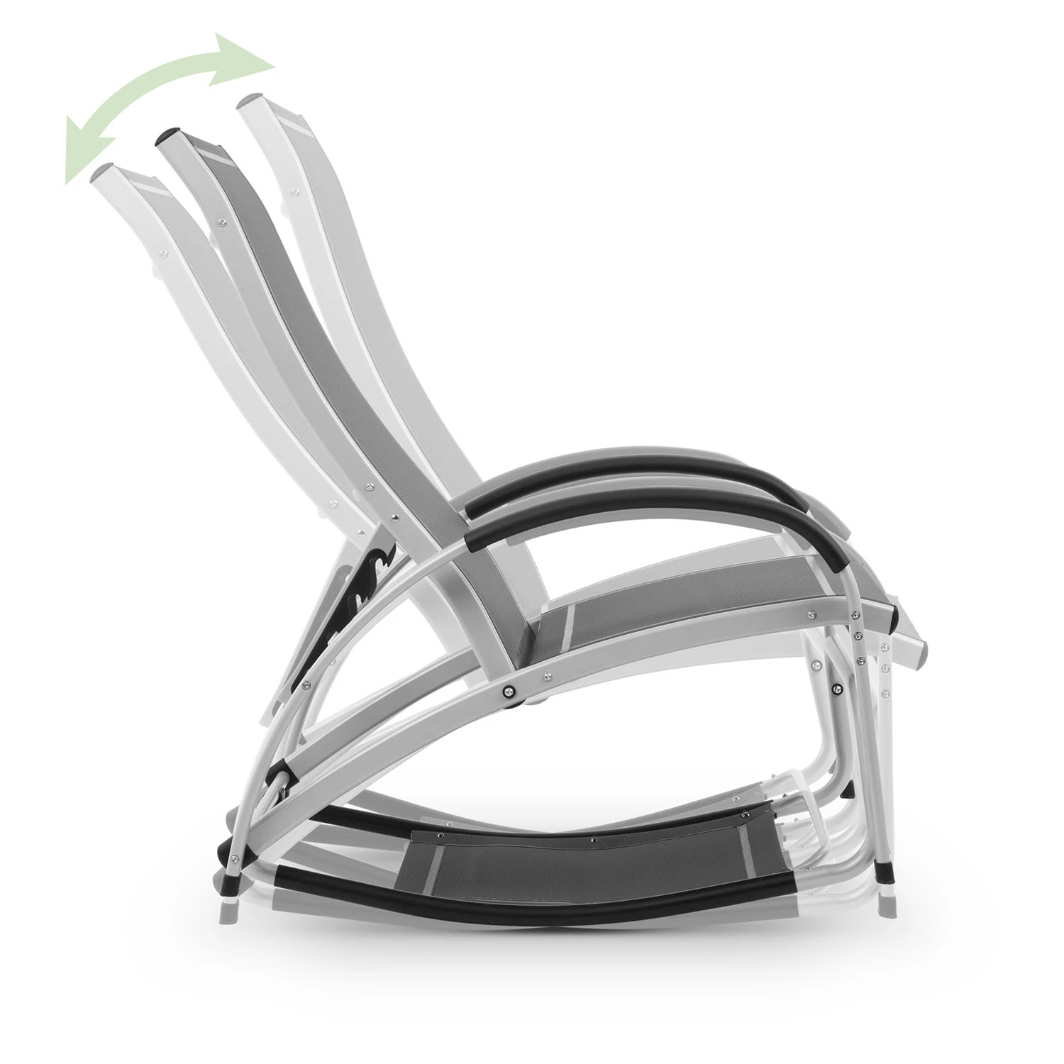 Außergewöhnlich: Innerhalb weniger Sekunden ist aus der Sonnenliege ein Schaukelstuhl geworden. Dabei wird lediglich das Fußteil nach unten geklappt und durch Einrasten in zwei Halterungen befestigt – schon lässt es sich entspannt schaukeln. Natürlich ist auch hierbei die Rückenlehne verstellbar, was den Komfort noch zusätzlich erhöht. Die Gartenliege bzw. der Schaukelstuhl ist mit dem stabilen Rahmen aus Aluminium nicht nur robust, sondern auch besonders leicht und lässt sich mühelos woanders positionieren.