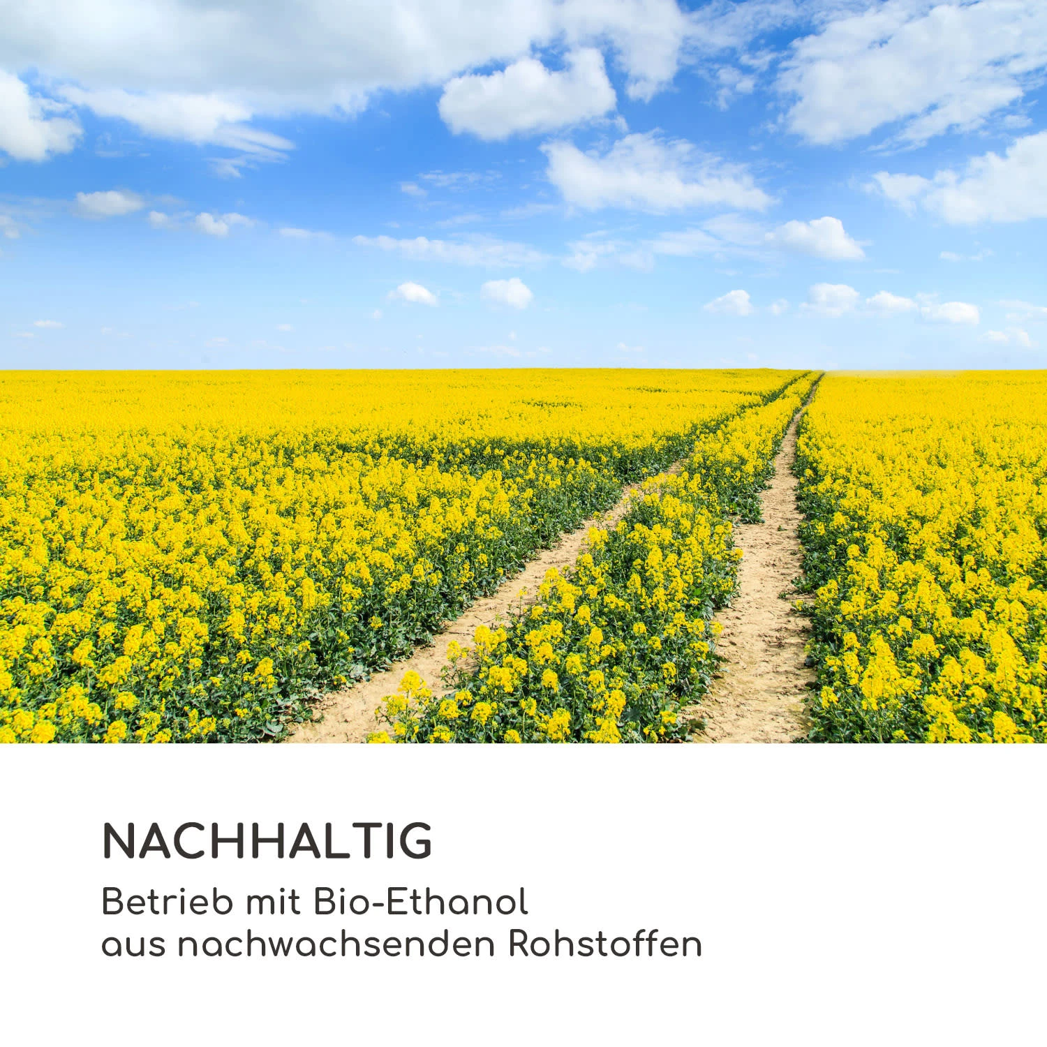 Du wünschst dir eine entspannte Kaminzimmer-Atmosphäre ohne unangenehme Gerüche und mit 360° Fireview? Mit dem blumfeldt Fiamme Circulo Ethanol-Kamin muss dies kein Wunschtraum bleiben. Der Fiamme Circulo wird komplett mit Bio-Ethanol aus nachwachsenden Rohstoffen betrieben. Sein Edelstahl-Brenner fasst 1,2 Liter und sorgt für bis zu 5 Stunden Feuerfreude. Dank seines runden Designs mit drei Sichtscheiben aus gehärtetem Glas hast du einen wunderbaren 360°-Blick auf die Flammen. Natürlich kann der Fiamme Circulo auch im Außenbereich aufgestellt werden und auf deiner Terrasse oder im Garten seine Gemütlichkeit versprühen. Bei Nichtgebrauch schützt ihn das beiliegende Regencover. Zum sicheren Löschen der Flamme ist ein praktischer Löschhaken im Lieferumfang enthalten.