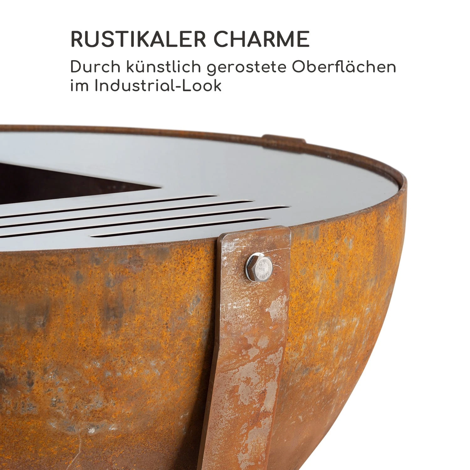 Genieße den Abend im Garten oder auf der Terrasse: mit der blumfeldt Fire Globe Feuerschale mit Grill macht es gleich doppelt Spaß. In der 60 cm durchmessenden Feuerschale spenden Scheithölzer mit flackernden Flammen wohlige Wärme und Lagerfeuer-Atmosphäre. Die solide Schale ist aus 2,8 mm dickem Stahl gefertigt – so ist sie witterungsbeständig und robust. Lecker wird es, wenn bei der Fire Globe Feuerschale die 59 cm breite verchromte Grillplatte zum Einsatz kommt. Dabei wird die Platte an drei Stahlseilen befestiget und über die Feuerschale gehängt. Mit dem Zugseil kannst du sie wie mit einer Angelrute in der Höhe verstellen und so die Hitze für dein Grillgut anpassen. Zusätzlich kannst du auf der emaillierten Grillplatte weitere leckere Grillspezialitäten zubereiten.Der kreuzförmige Standfuß sorgt sowohl beim Grillen als auch beim Gebrauch als Feuerschale für einen soliden Stand. Der Fire Globe fügt sich mit seinem Industrie-Design im Rost-Look spielend in jedes Garten- oder Terrassenambiente ein.