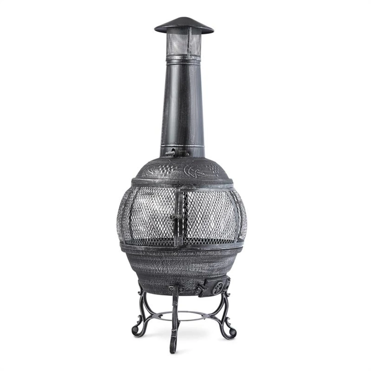 Mit dem Blumfeldt Flavius Gartenofen wird richtig eingeheizt: Der stabile Ofen ist aus bruchfestem Gusseisen und stabilem Stahl gefertigt und verströmt in Minutenschnelle wohlige Wärme. Einfach Kohle, Holz oder Holzkohle im Inneren entzünden und über Stunden Wärme genießen. Eine praktische Zugluftklappe am Boden lässt das Feuer schnell auflodern. Das 360° Rundum-Gitter verhindert Funkenflug und ermöglicht gleichzeitig einen faszinierenden Blick ins Feuer von allen Seiten. Dank der 90 cm hohen Esse steigt Rauch schnell auf und zieht gut ab, während die Hitze des Ofens geschickt verteilt und an die Umgebung abgegeben wird. Mit seinem schicken Äußeren im antiken Design eines Römerofens heizt der Blumfeldt Flavius Terrassenofen nicht nur kräftig ein, er verleiht den Stunden im Freien auch eine einzigartige Atmosphäre. Dekorative Verzierungen sowie eine Oberfläche in einem glänzenden Silberton unterstreichen gekonnt das Ambiente.