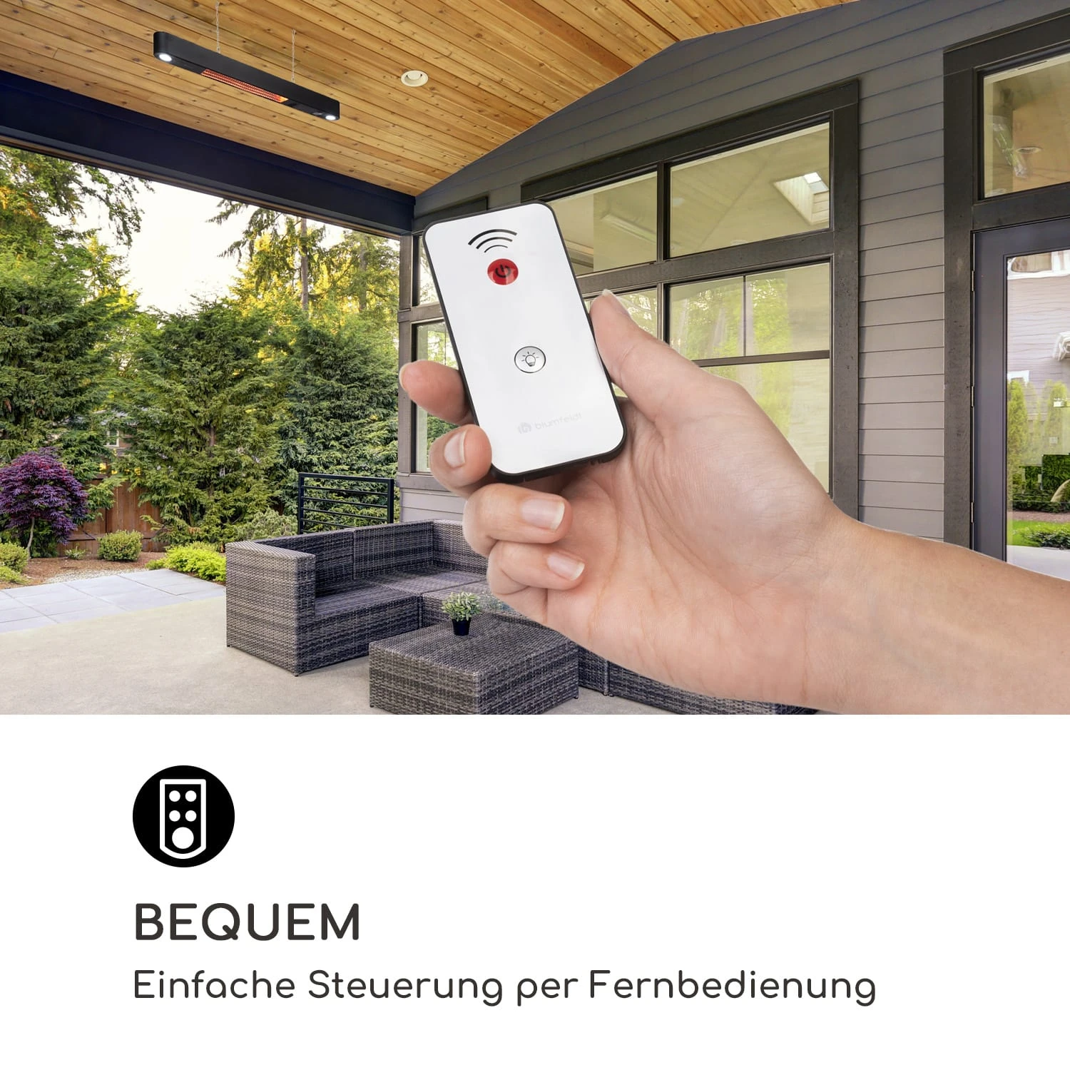 Der leichte blumfeldt Gold Bar Shine Infrarot-Heizstrahler lässt sich einfach an der Wand oder an der Decke montieren und steht dadurch nicht im Weg, während alle Terrassengäste schnell und effizient mit einer Leistung von 2000 Watt von oben gewärmt werden. Dabei macht sich die IR ComfortHeat-Technologie das Prinzip der Sonnenwärme zu nutze. Gezielt werden angestrahlte Objekte und Personen gewärmt, ohne den Umweg über die Lufterwärmung zu gehen. So kann selbst eine frische Brise die Heizleistung kaum beeinflussen. Mit seiner praktischen Fernbedienung lassen sich in Sekundenschnelle die Heizfunktion sowie die zuschaltbare Deckenbeleuchtung mit 2 LED-Leuchten ein- und ausschalten.