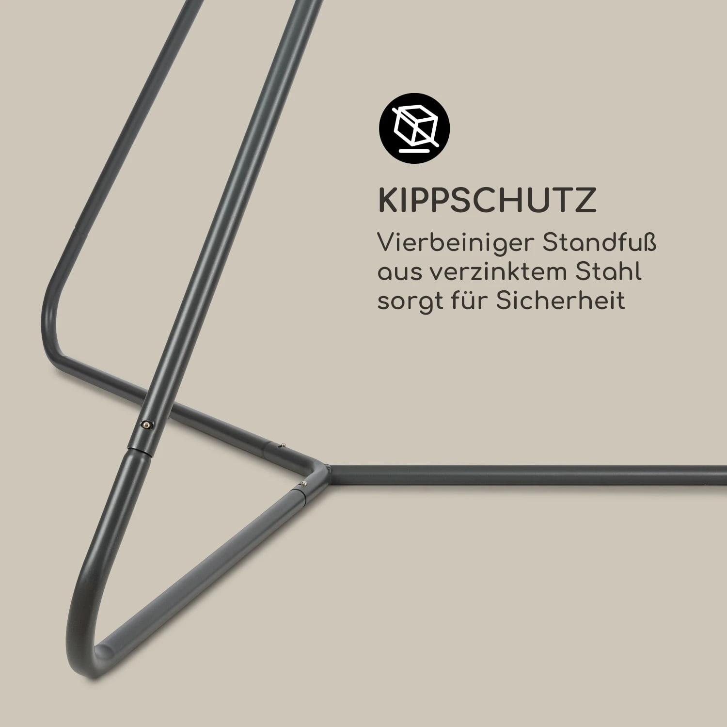 Der robuste Ischia Hängesitz-Rahmen ist dank seiner 3,2 Ø cm dicken Stahlrohre sehr stabil und kann problemlos bis zu 300 kg Gewicht tragen. Durch seine verzinkten Rohre und die Pulverbeschichtung ist er wetterbeständig und für den Außeneinsatz bestens vorbereitet. Zusätzliche Sicherheit verleiht die vierbeinige Konstruktion, die das Gerüst vor dem Umkippen schützt. Durch das Steck-System ist der Aufbau im Nu vollbracht und erfordert kein zusätzliches Werkzeug. Abgerundet wird das Hängesitz-System durch eine starke Metallkette und einen Karabinerhaken, die das Aufhängen von Hängesitzen zum Kinderspiel machen.