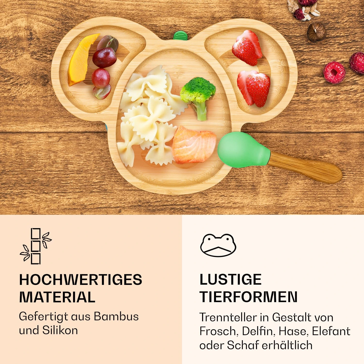 Spiel und Spaß beim Essen! Das Kindergeschirr mit Bambusteller und Löffel von Klarstein ist nahezu unverwüstlich! Dafür sorgen das robuste Bambus-Material und der Silikon-Saugnapf, der den Essteller am Tisch befestigt. Besonders viel Freude bei den kleinen Gourmets bereiten aber die lustigen Tierformen des Tellers: Mit Frosch, Hase, Schaf, Elefant oder Delfin isst es sich gleich viel interessanter! Alle Trennteller sind aus Bambus gefertigt und enthalten keine Chemikalien oder Schadstoffe. Qualitätskontrollen versichern außerdem, dass sie keinen Eigengeruch oder Eigengeschmack an die Nahrung abgeben. Du kannst sie somit jederzeit mit heißen wie kalten, festen wie flüssigen Lebensmitteln befüllen. Das motivierende Lernbesteck – bestehend aus einem Teller und einem farblich passenden Löffel – ist eine tolle Geschenkidee für frisch gebackene Eltern und ihren kleinen Nachwuchs.