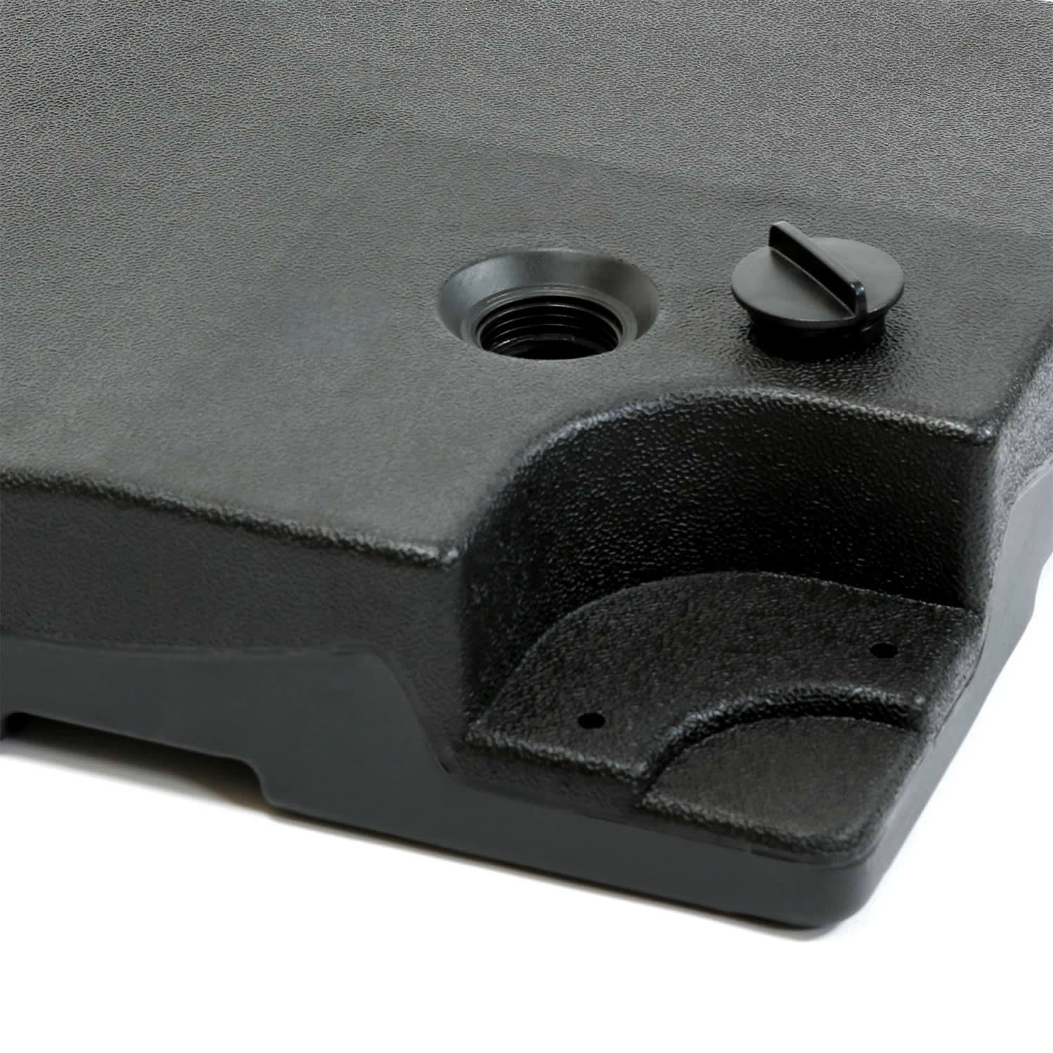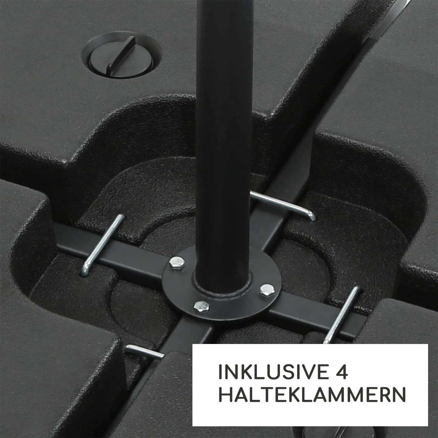 Neben ihrer zuverlässigen Funktion als Beschwerungselemente überzeugen die Sonnenschirmständer-Gewichte auch in Optik und Komfort. Sie passen sich geschickt an das Bodenkreuz deines Schirmständers an und ergeben so einen modernen Sockel. Ein seitlicher Tragegriff macht die Leergewichte zu einem sehr praktischen Sommer-Accessoire.