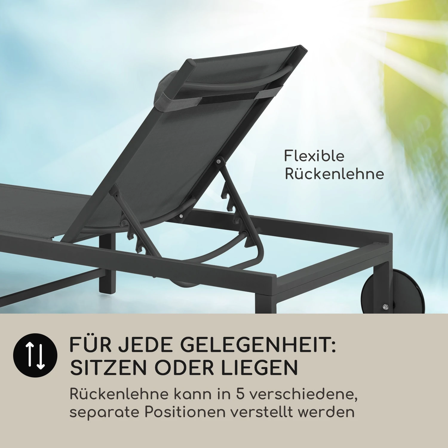 Willkommen auf dem Sonnendeck! Raus aus dem Alltag, rein in die Badehose oder den Bikini und rauf auf die blumfeldt Lucca Sonnenliege, um genüsslich zu entspannen – im Garten, auf der Terrasse, dem Balkon und natürlich auch am Pool.