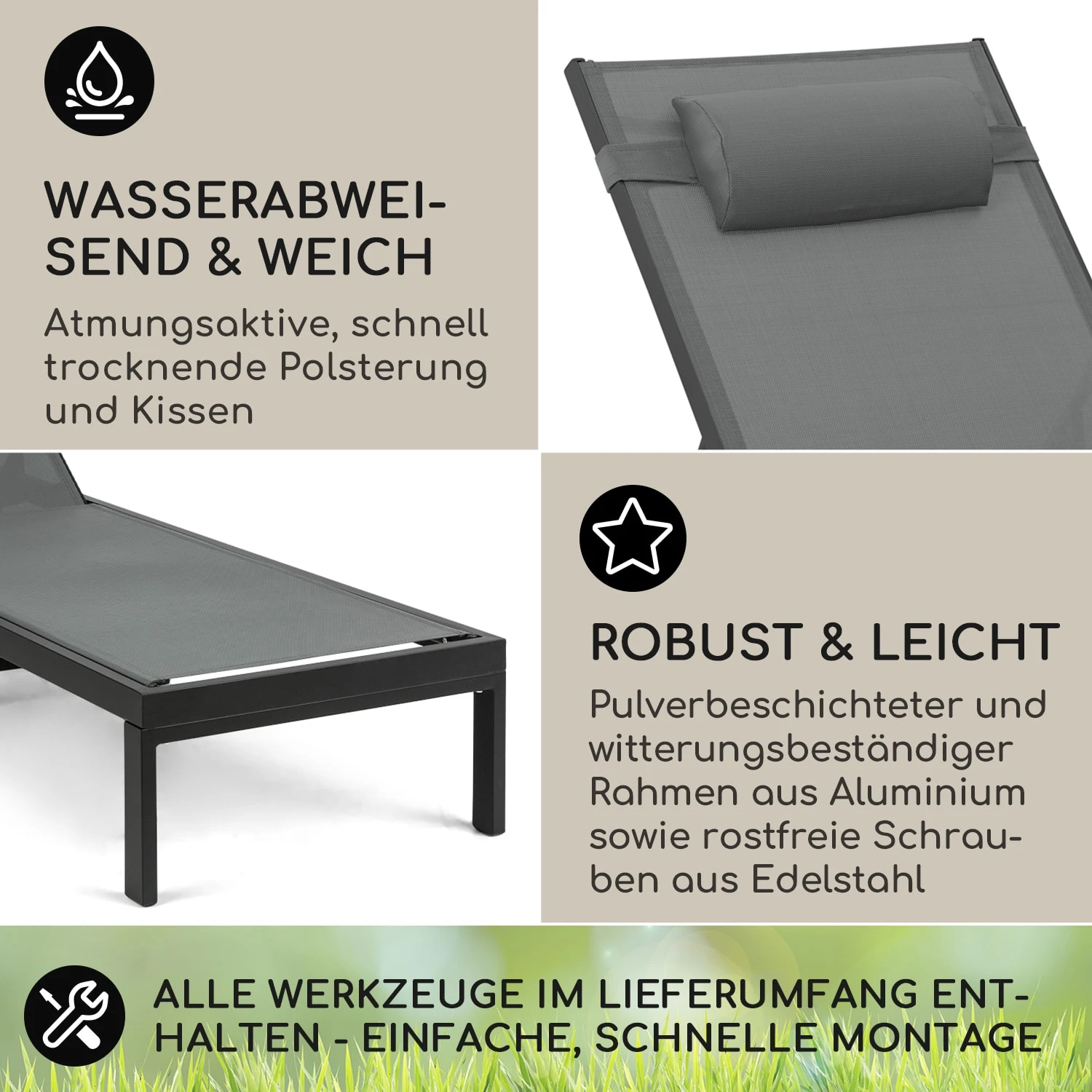 Mit der neuen blumfeldt Lucca Gartenliege wird dieses Jahr noch bequemer Sonne getankt. Denn dank der neuen extra weichen Polsterung samt Kissen ruhst du auf dem 187 cm langen und 57 cm breiten Lounger jetzt wirklich wie auf Wolken. Natürlich ist die Polsterung mit Textilen-Bespannung luftdurchlässig, wasserabweisend und schnelltrocknend – also ideal für den Garten oder die Terrasse. Die flexible Rückenlehne kannst du in 4 unterschiedlichen Höhenpositionen genau deinen Bedürfnissen anpassen. Zusätzlich lässt sich die Lehne auch komplett herunterklappen. So steht einem Nickerchen an der frischen Luft nichts mehr im Weg. Das farbechte Gitter-Gewebe ist witterungsbeständig und trocknet besonders schnell, damit ist die Lucca auch für den Einsatz am Pool bestens geeignet. Das Gestell ist aus stabilen Aluminiumkantrohren gefertigt, sodass die gesamte Liege gerade einmal 10 kg wiegt. Die Pulverbeschichtung der Metallteile bietet zusätzliche Wetterbeständigkeit und lässt sich leicht reinigen. Für die nötige Mobilität sorgen zwei große Bodenrollen, die das Versetzen der Sonnenliege zum Kinderspiel machen.