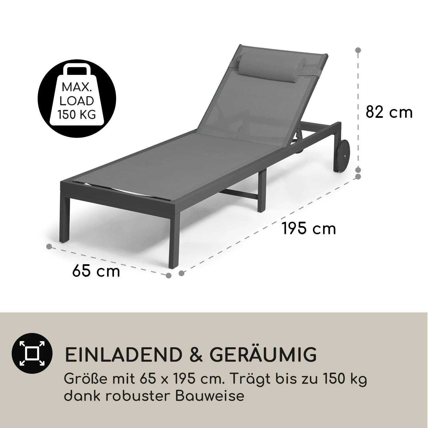 - Stellmaße aufgerichtete Lehne: ca. 65 x 82 x 195 cm (BxHxT)
