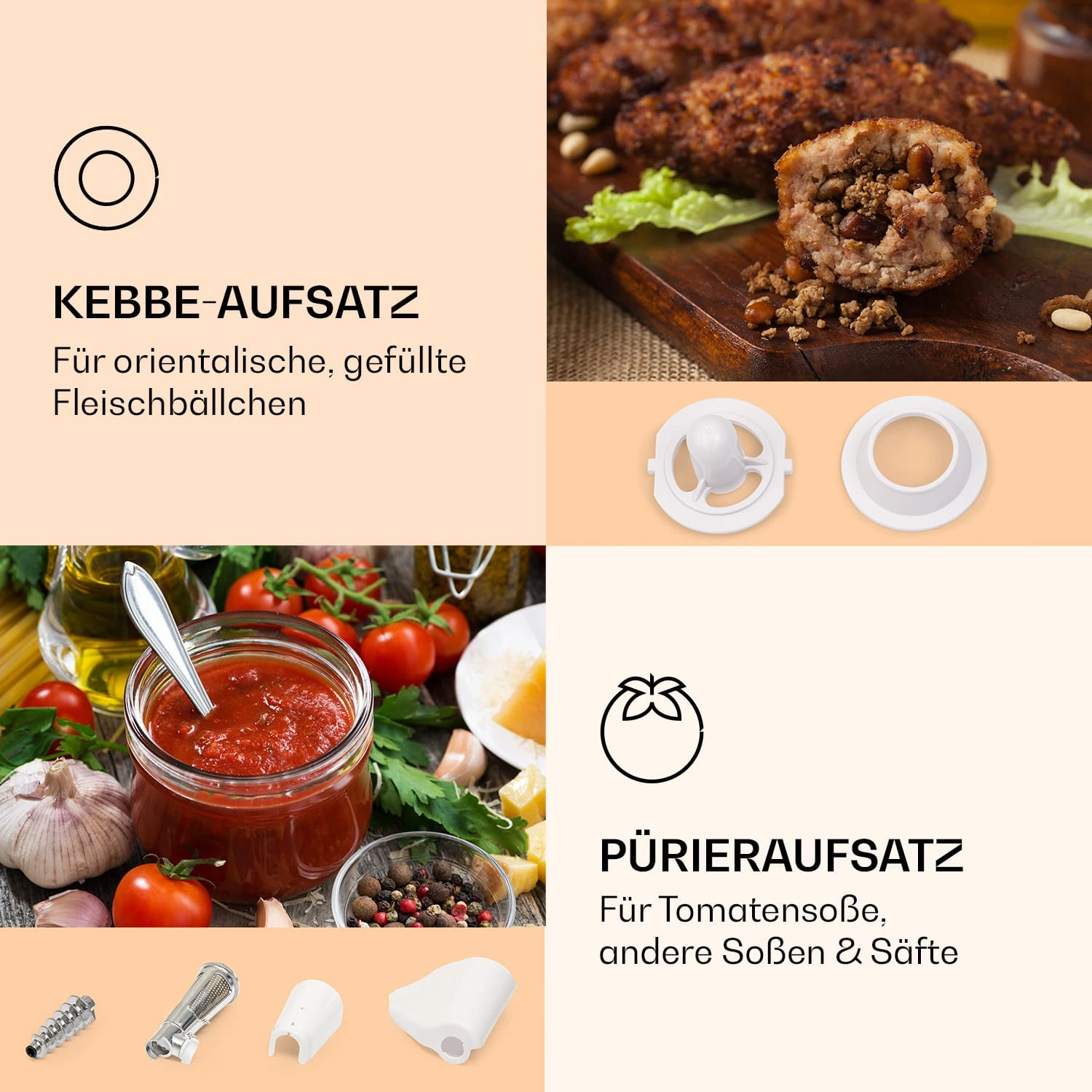 Für selbstgemachte Tomatensoße: Der Mighty Mince kommt inklusive einem praktischen Pürieraufsatz für Säfte und Soßen. Und sogar, wenn du Wienerle oder Weißwürste selbst herstellen willst, ist dieser Fleischwolf das perfekte Gerät – im Lieferumfang ist dafür ein Wurst- sowie ein Kebbe-Aufsatz für gefülltes Fleisch enthalten.