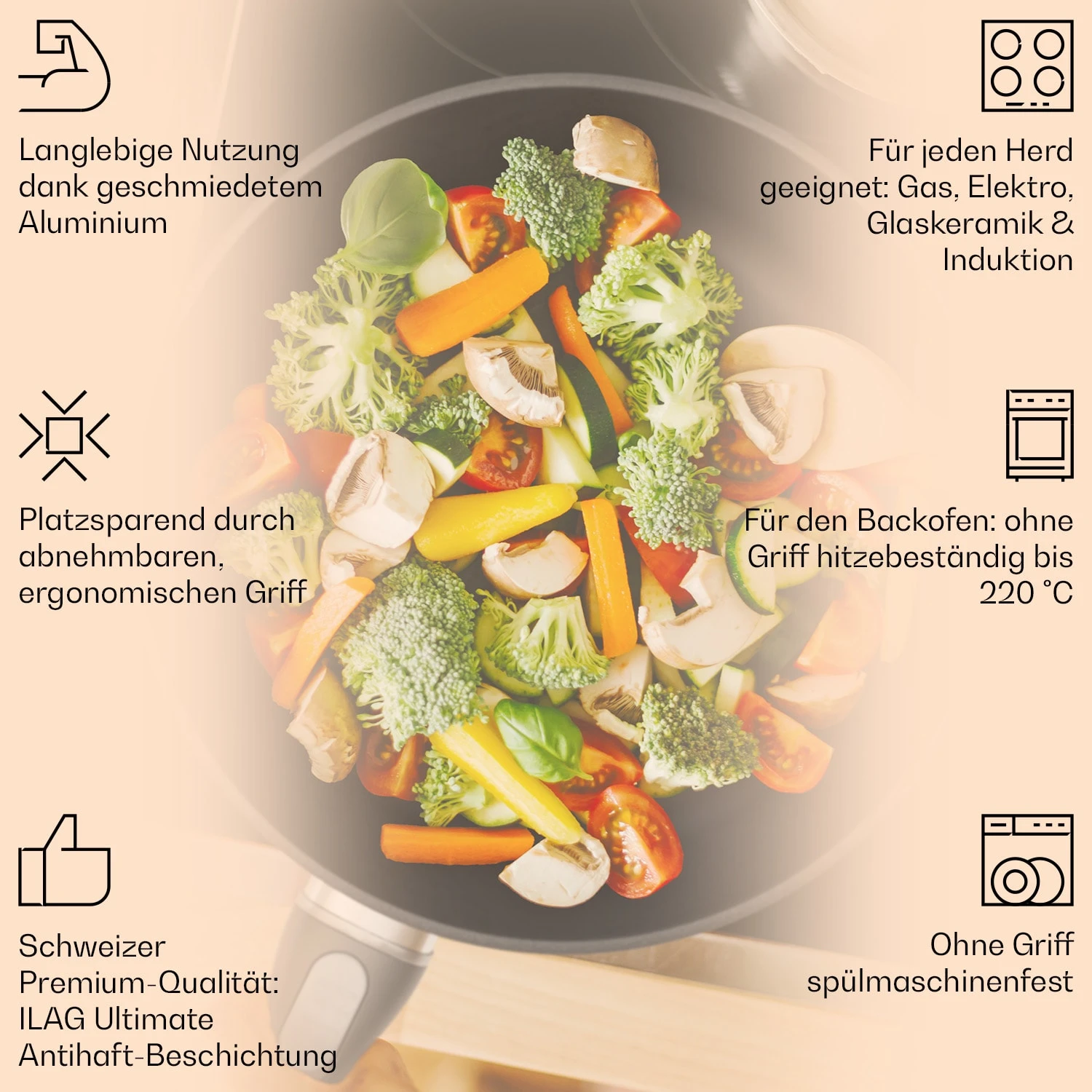 Mit dem Klarstein Noto Endurance Bratpfannen-Set kannst du energiesparend brutzeln und dank abnehmbarem Griff überraschenden Küchenkomfort erleben!