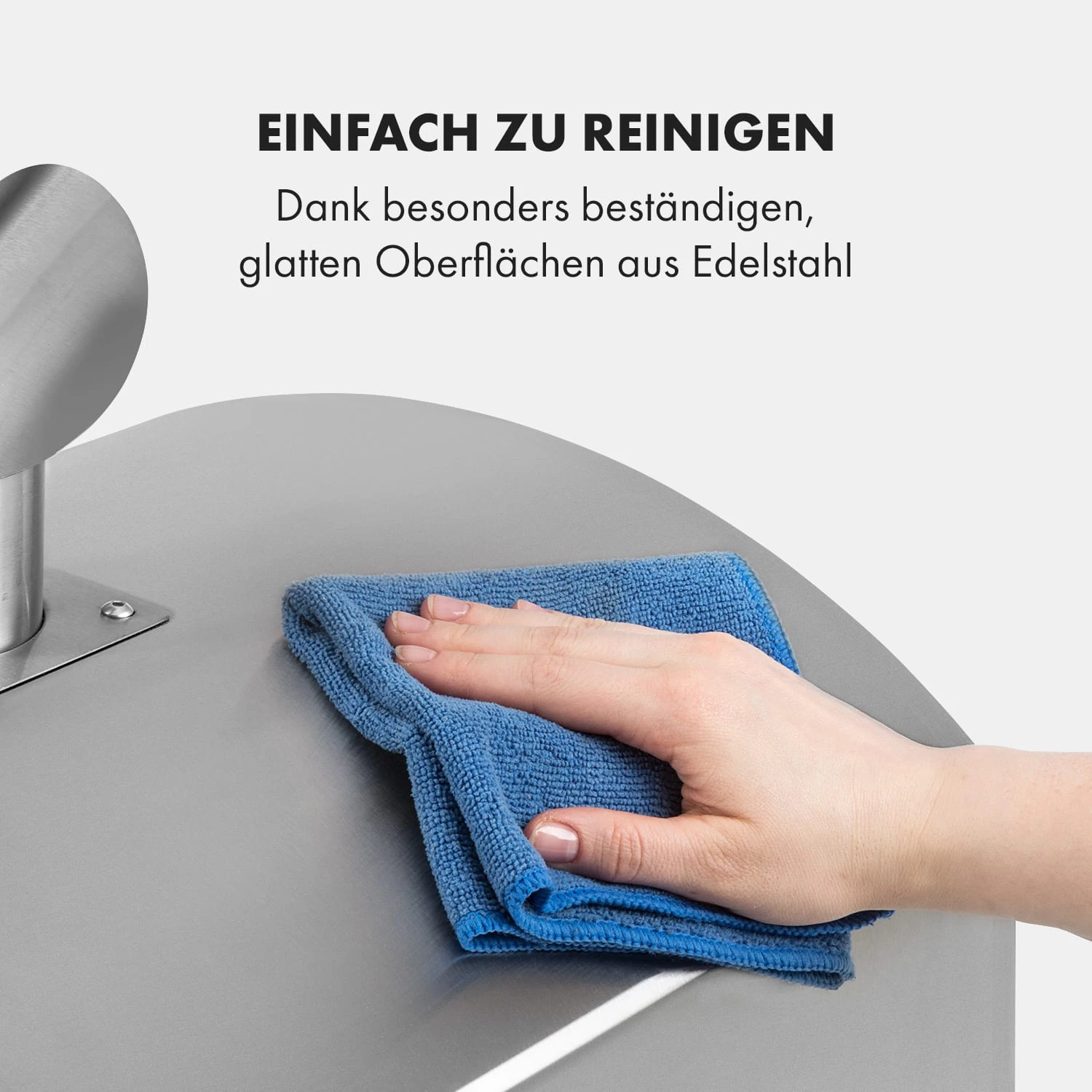 Dank einer Befeuerung mit Gas lässt sich der Pizzaiolo Neo Pizzaofen von Klarstein ganz ohne Stromanschluss im Kreis von Freunden und Familie draußen im Grünen nutzen. Die Bedienung ist sehr einfach: Du schließt die Gasflasche an den Ofen an und entzündest mit Hilfe des im Bedienknopf integrierten Zünders die Flamme. Die Temperatur hast du durch ein eingebautes Thermometer jederzeit im Blick, während das Gehäuse aus Edelstahl für eine schnelle Hitzeverteilung sorgt. Der Pizzaiolo Neo ist dank glatter Oberflächen und hochwertiger Materialien schnell und einfach zu reinigen und ermöglicht eine langlebige Nutzung. Der 33 cm große Pizzastein ist vor allem für Pizzen, Flammkuchen und Backwaren geeignet. Der Grillrost ist hingegen für leckeres und perfekt zubereitetes Fleisch und Gemüse zuständig. Ein Abtropfblech kümmert sich dabei um herabfallende Krümel und Fettreste und hält den Korpus zuverlässig sauber. Für einen sicheren Stand sorgen vier robuste Füße.