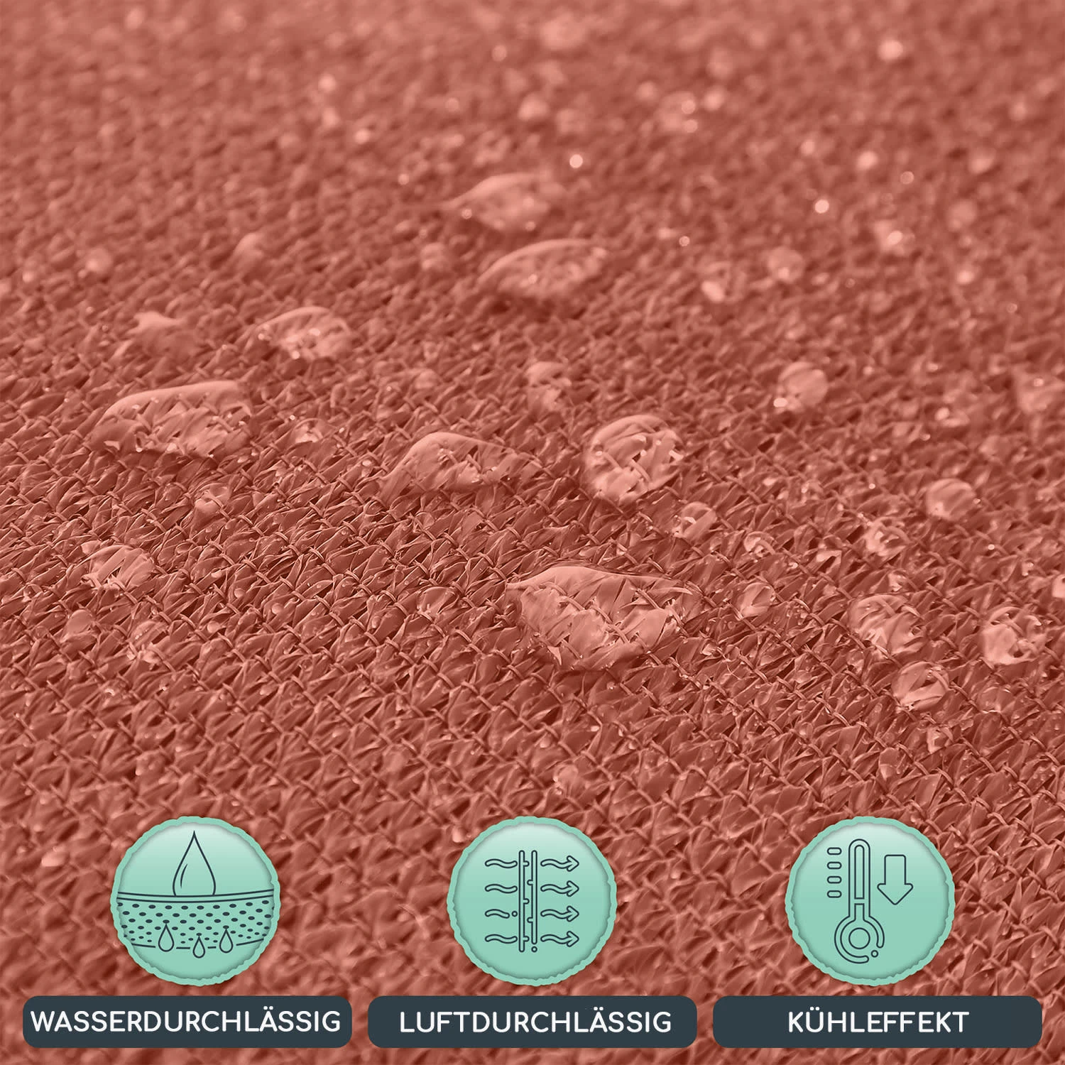 Dank der rostfreien Ringe aus Edelstahl ist die Befestigung sehr unkompliziert. Ziehe einfach die Seile durch die Befestigungsringe, welche du in der Umgebung beliebig anbindest. Für eine dauerhafte Anbringung empfehlen wir dir, anstelle der Seile, Spann- oder Karabinerhaken zu verwenden. Dank des reißfesten und strapazierfähigen Polyester-Materials kannst du das Sonnensegel sehr straff und glatt aufspannen. Zudem ist das Material sehr luftdurchlässig, was dafür sorgt, dass sich unter dem Dach keine Hitze staut. Das Segel hält den Regen ab und ist zudem sehr belastbar, durch festes Material, hochwertige Verarbeitung und doppelte Nähte.