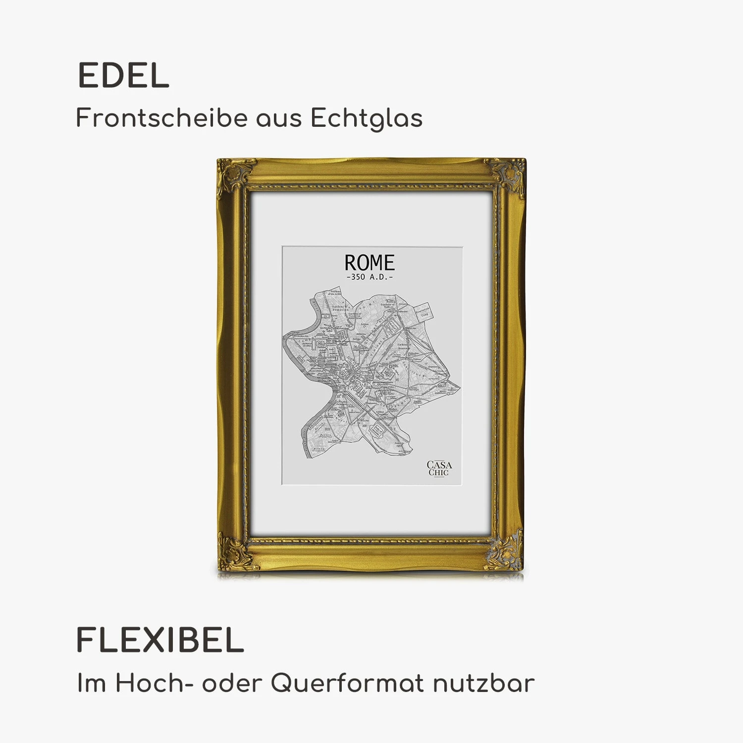 Die Regent Bilderrahmen von Casa Chic by blumfeldt sind aus Echtholz gefertigt und mit Kunstharzornamenten bestückt. Sie bringen deine Fotos und Bilder sowohl im Hoch- als auch im Querformat ideal zur Geltung. Dabei bildet das aufwendig gestaltet Rahmenprofil im Rokoko-Design einen wunderschönen Kontrast zu modernen Einrichtungen. Gestalte Wandcollagen oder arrangiere deine Lieblingsfotos auf dem Sideboard oder im Regal. Das mitgelieferte Passepartout überlässt dir die Wahl des passenden Bildausschnitts. Die Echtglasscheibe schützt nicht nur vor Staub und Schmutz, sie vervollständigt gekonnt den edlen Look der Regent Rahmen.