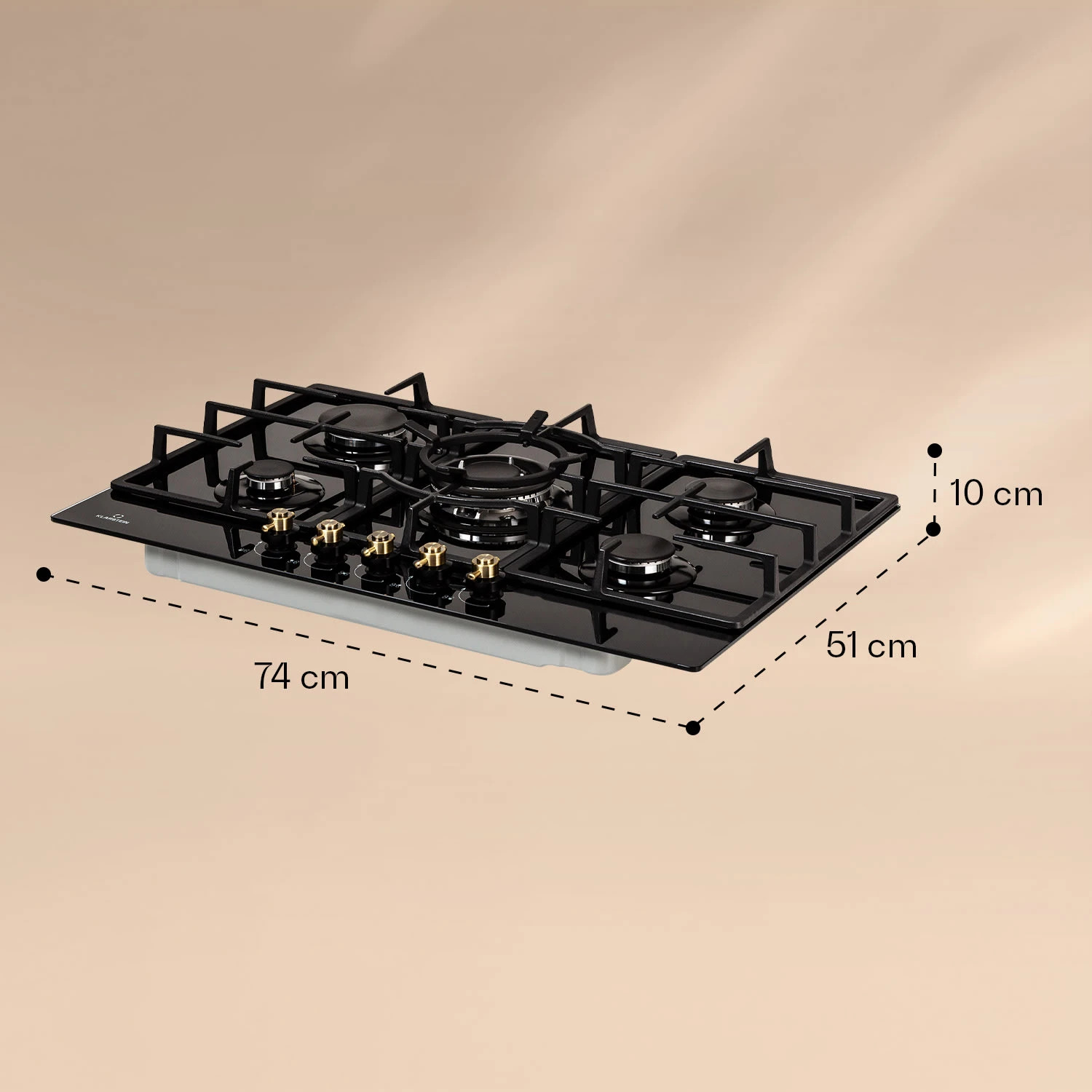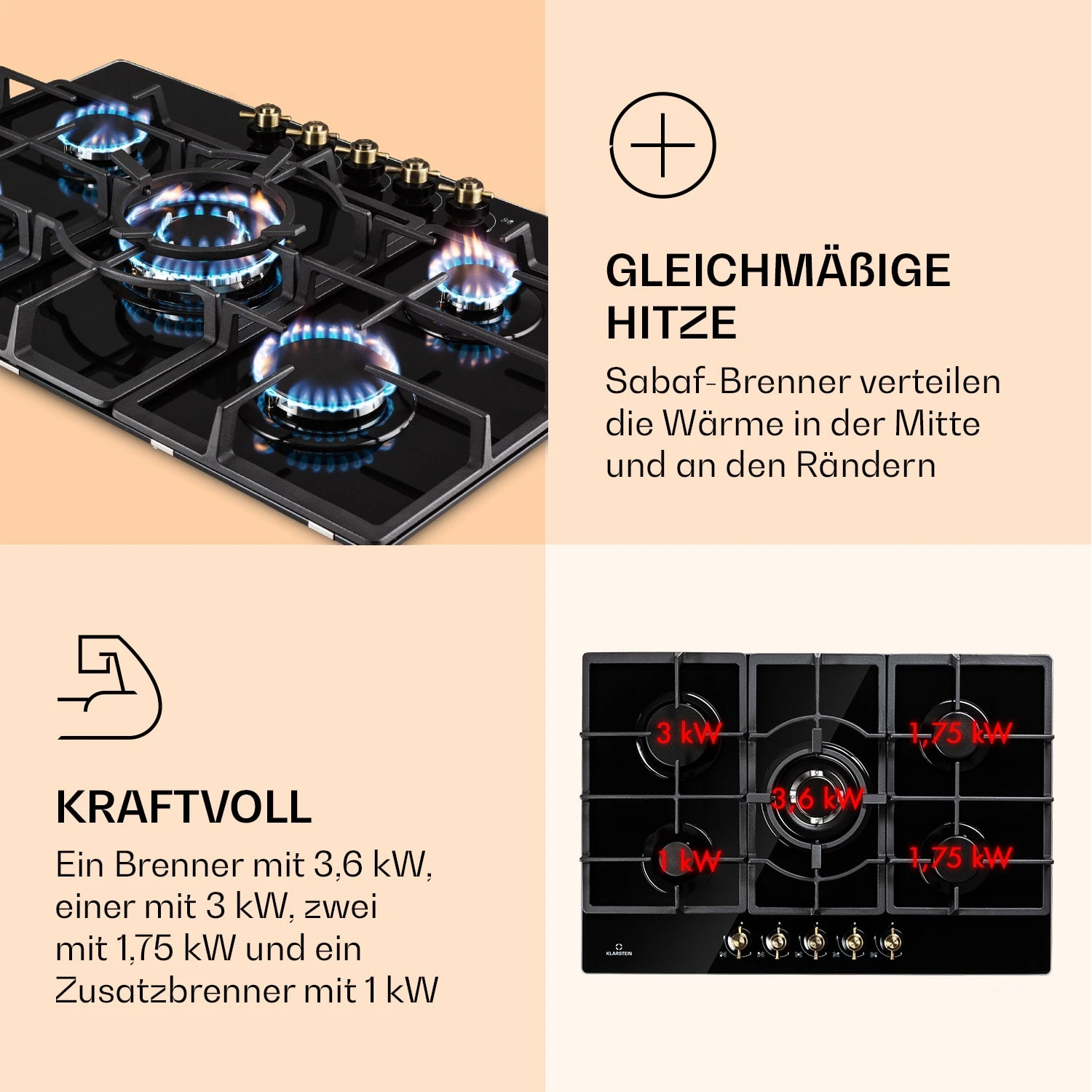 Auf dem geräumigen Klarstein Victoria 5 Gaskochfeld befinden sich fünf hochwertige Sabaf-Brenner, die mit einer Leistung von jeweils 3,6 kW, 3,0 kW und 1 kW sowie zweimal 1,75 kW ordentlich einheizen. Durch seine unterschiedlichen Brenner-Größen ist das Victoria 5 für jede erdenkliche Mahlzeit geeignet – dabei verteilen die Brenner die Hitze gleichmäßig in der Mitte und an den Rändern deines Kochgeschirrs, so wird alles perfekt gegart. Die Bedienung ist dank der selbsterklärenden Symbole an den großen im Retro-Design gestalteten Drehknöpfen absolut intuitiv, die Hitzezufuhr kann während des Kochvorgangs immer wieder direkt angepasst werden. Via SnapJetIgnition entzündest du die Flamme, somit ist kein zusätzliches Feuer nötig. Die drei abnehmbaren Kreuze aus massivem Gusseisen sitzen passgenau und kippsicher über den Flammen. Das Kochfeld ist mit einer gehärteten, pflegeleichten Keramikglas-Beschichtung versehen, die nicht nur gut aussieht, sondern auch besonders leicht zu reinigen ist.