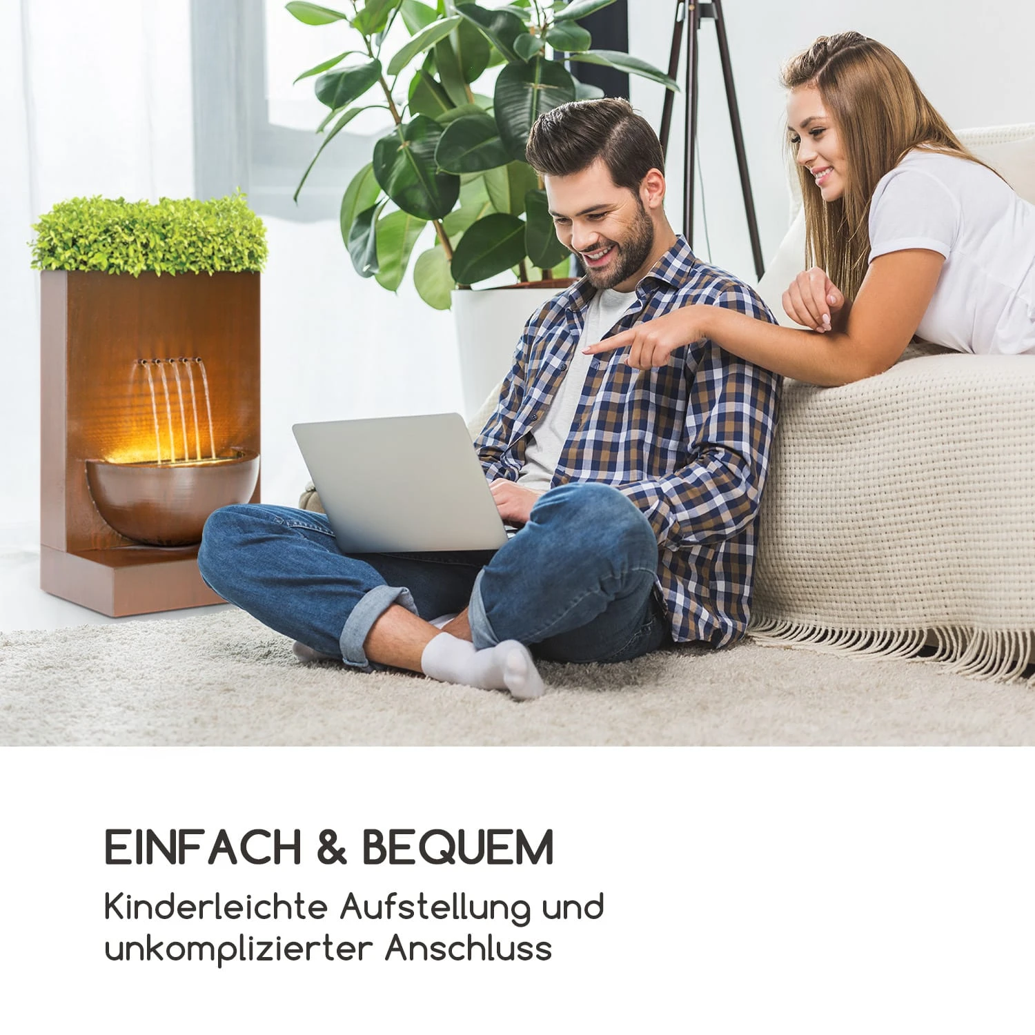 Über insgesamt 5 kleine Öffnungen fällt das Wasser in einem formschönen Bogen in das darunterliegende Becken. Eine 20 cm lange LED-Lichtleiste beleuchtet das Geschehen von unten und setzt die 5 glitzernden Wasserstrahlen eindrücklich in Szene. Über dem kleinen Wasserfall befindet sich eine Aussparung, die als Pflanzschale für Blumen oder Grünpflanzen vorgesehen ist. Eine volle Blüte sowie ein frisches Grün werten im Zusammenspiel mit der kontinuierlichen Bewegung des Wassers jedes Garten- und Wohnambiente auf und verleihen ihm einen belebenden Charakter. Das Material aus verzinktem Metall verleiht dem Gartenbrunnen zudem einen hochwertigen Look, während die erdige Farbgebung eine angenehme Natürlichkeit ausstrahlt.