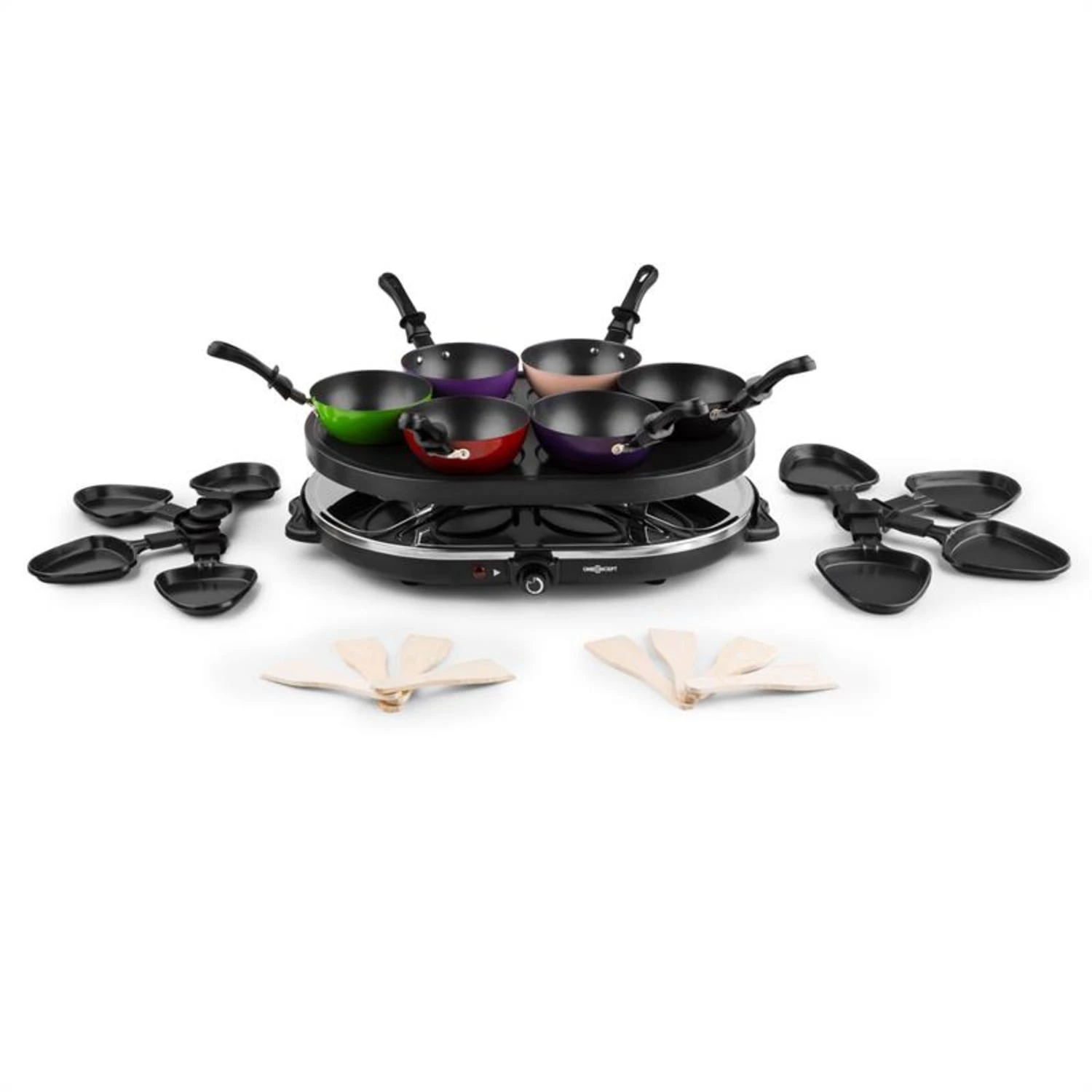 Der oneConcept Woklette Tischgrill ist der 3-in-1 Partyspaß für bis zu acht Personen. Unter der 1200 W starken Heizschlange braten und gratinieren acht dreieckige Raclette-Pfännchen ganz nach Herzenslust Fleisch, Kartoffeln, Gemüse und Käse. Auf der Bratplatte wird in sechs Wok-Pfännchen ebenso nach Gusto sautiert – der Grill-Phantasie sind nur durch die vorhandenen Zutaten Grenzen gesetzt. Damit nicht genug, kann auf der Bratplatte natürlich auch direkt gegrillt werden. Die Vertiefungen für die Wok-Pfännchen bieten sich dabei ideal zur Zubereitung von Crepes oder Pancakes an. Damit ist auch die Versorgung mit leckerem Nachtisch sicher gestellt. Für einfaches Hantieren ohne Kratzer in der Antihaft-Beschichtung sind acht Holzspatel im Lieferumfang enthalten.